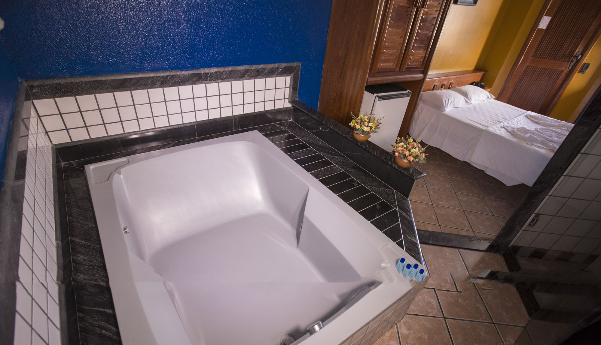 Equipado com ar condicionado, banheira de hidromassagem, tv, telefone, frigobar, internet Wi Fi, e vista para a piscina.